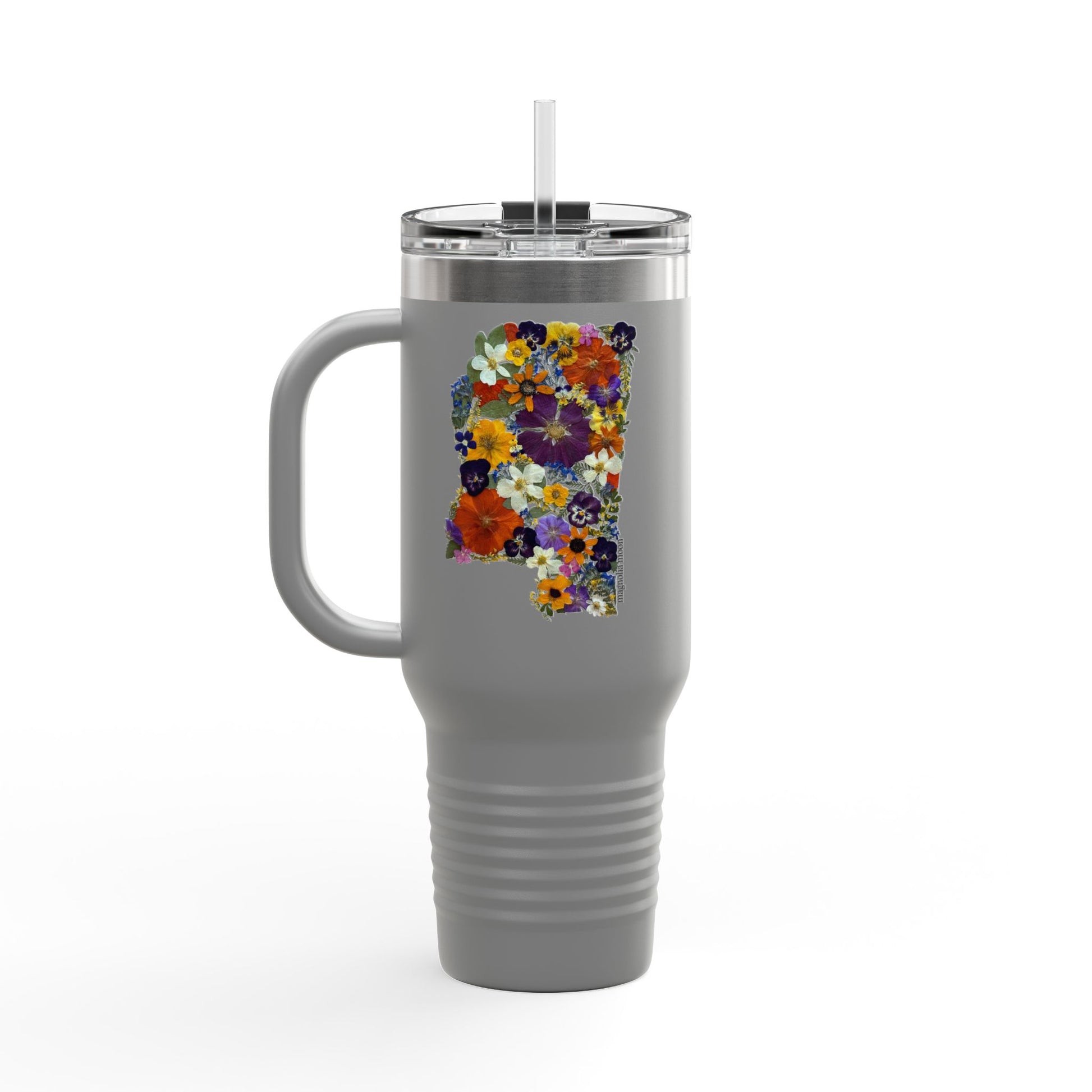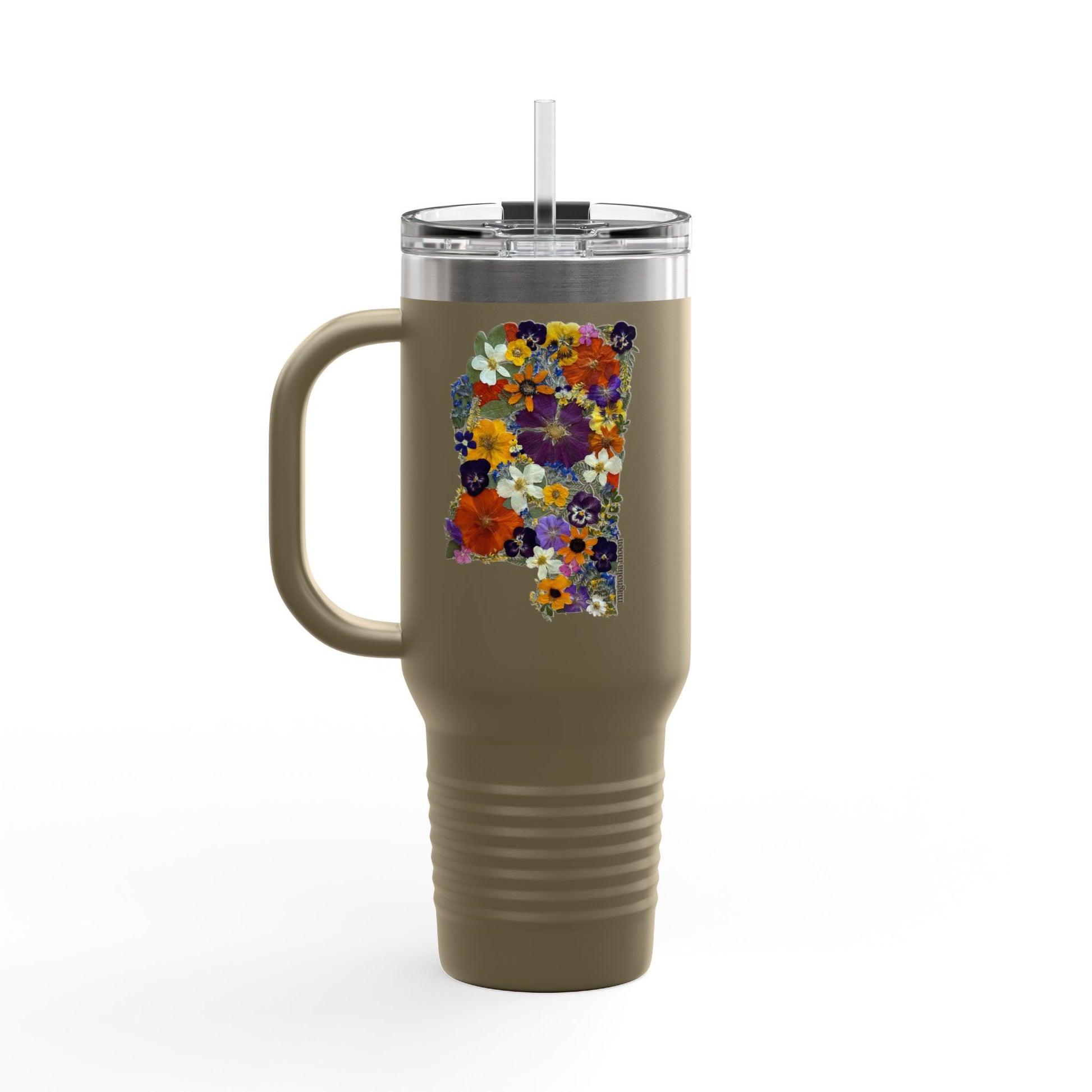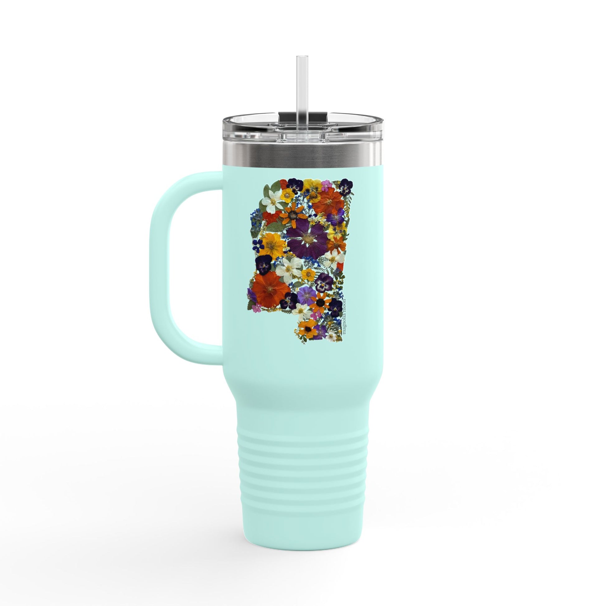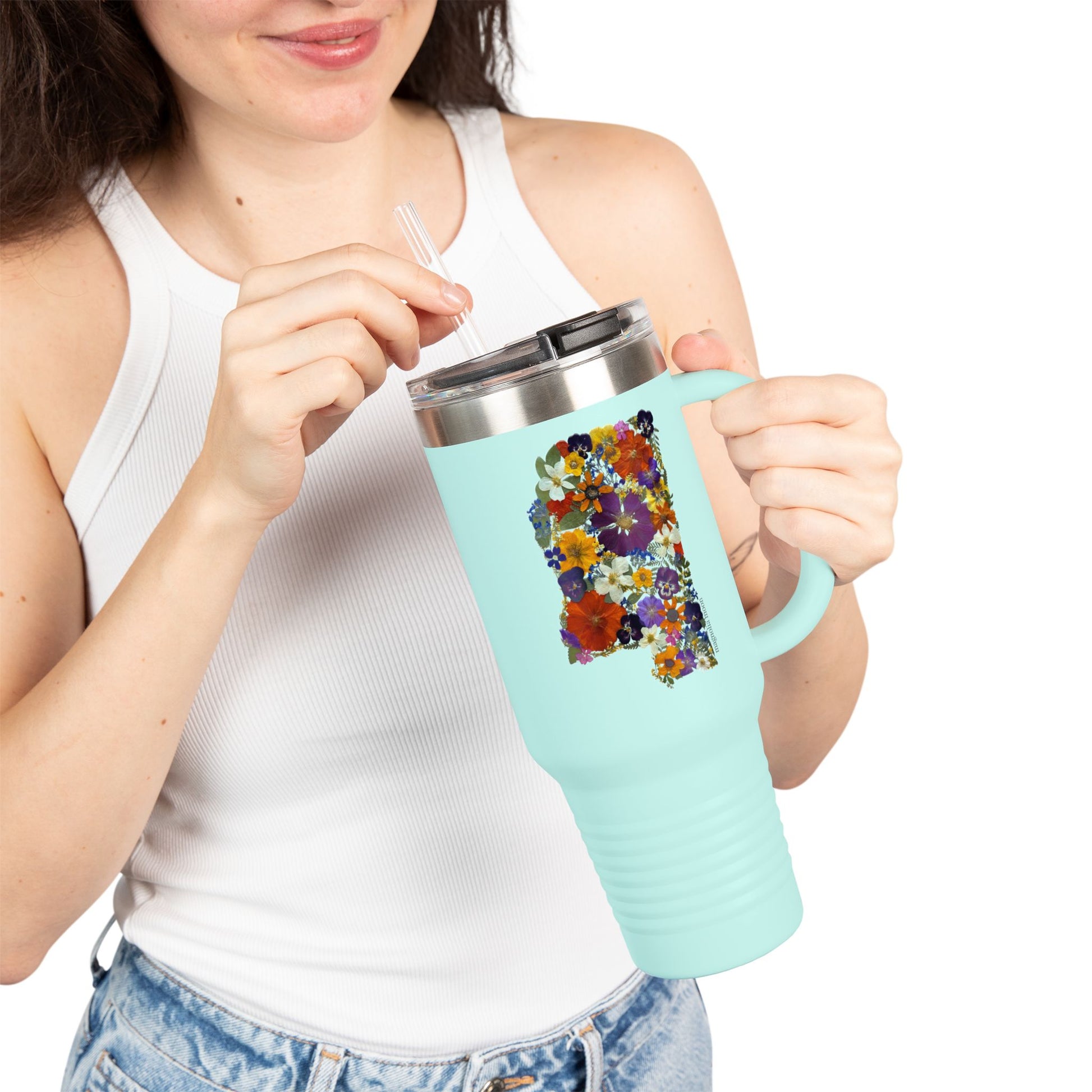 A tall, rugged companion for long days on the move. This 40oz insulated travel mug holds enough coffee, tea, or iced drink to keep you fueled from morning commute to late-afternoon fieldwork. Double-wall stainless steel keeps temperatures steady for hours while the ergonomic handle and leak-resistant lid make it easy to carry without worrying about spills. The powder-coated finish and colorful floral silhouette design add personality — a small burst of art that stands out on a crowded desk, campsite table, or car cup holder. Sturdy, BPA-free, and built to travel, it feels at home on trailheads, work sites, and weekend road trips.