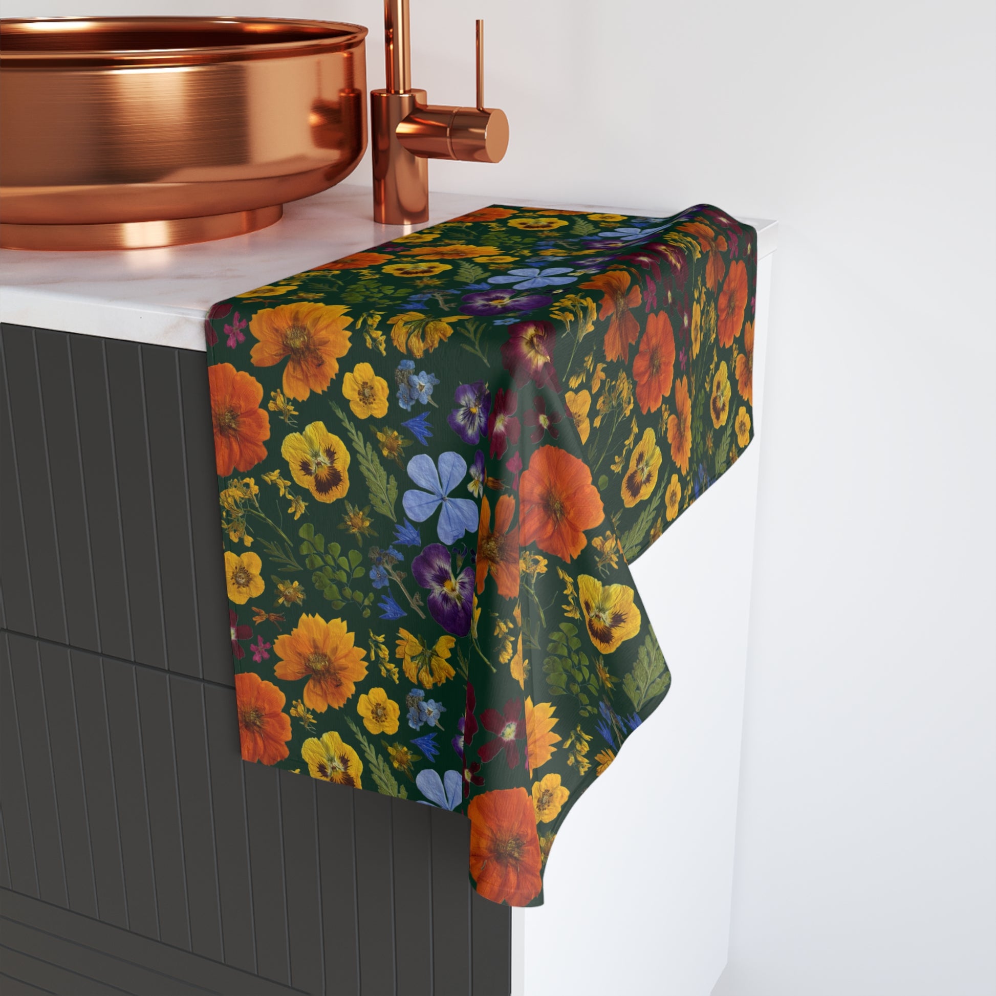 Hand towel featuring a Signature Magnolia Moon Pressed Flower Design that adds character to its surroundings.